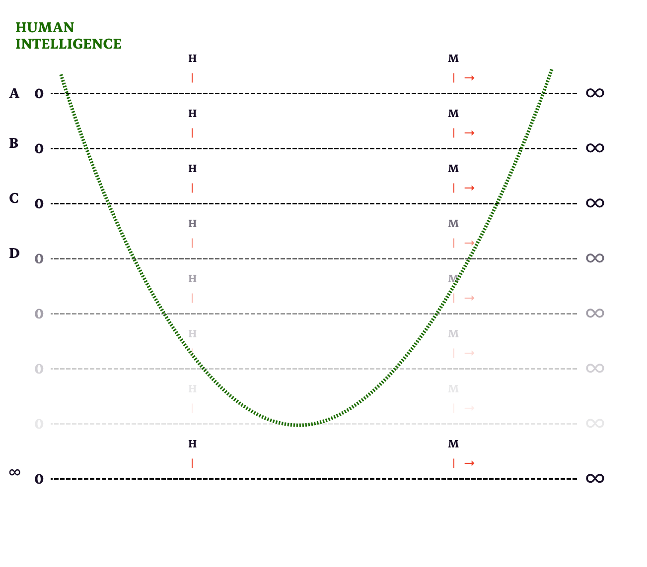 On the left, there is ‘0’, no intelligence is being used, and nothing is being done. We can learn to perform a task, and as a next step, we might relay this knowledge to a machine so that it could hyper-mathematize it.