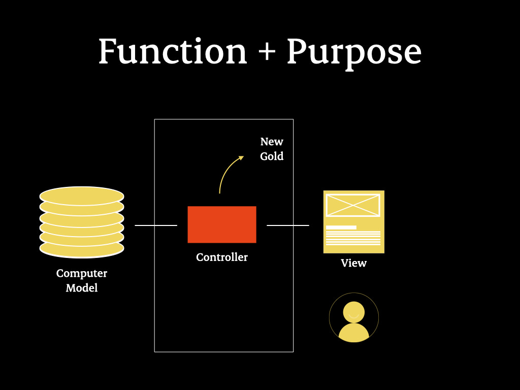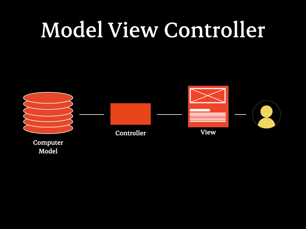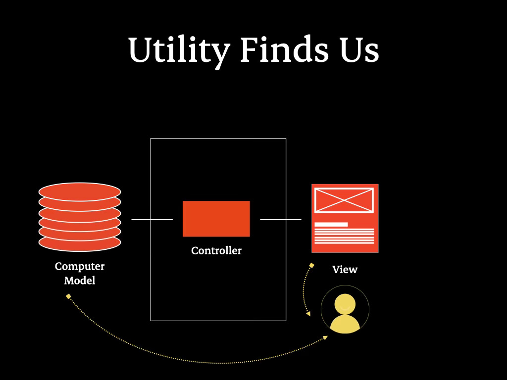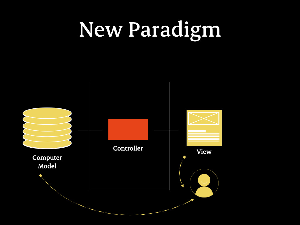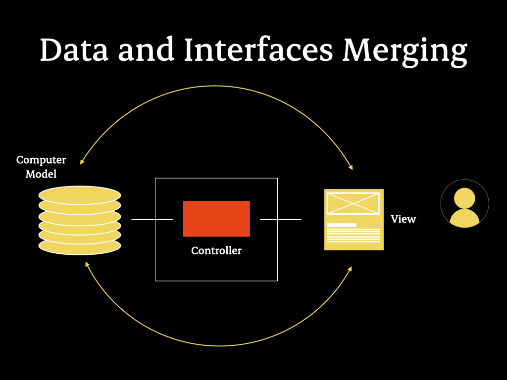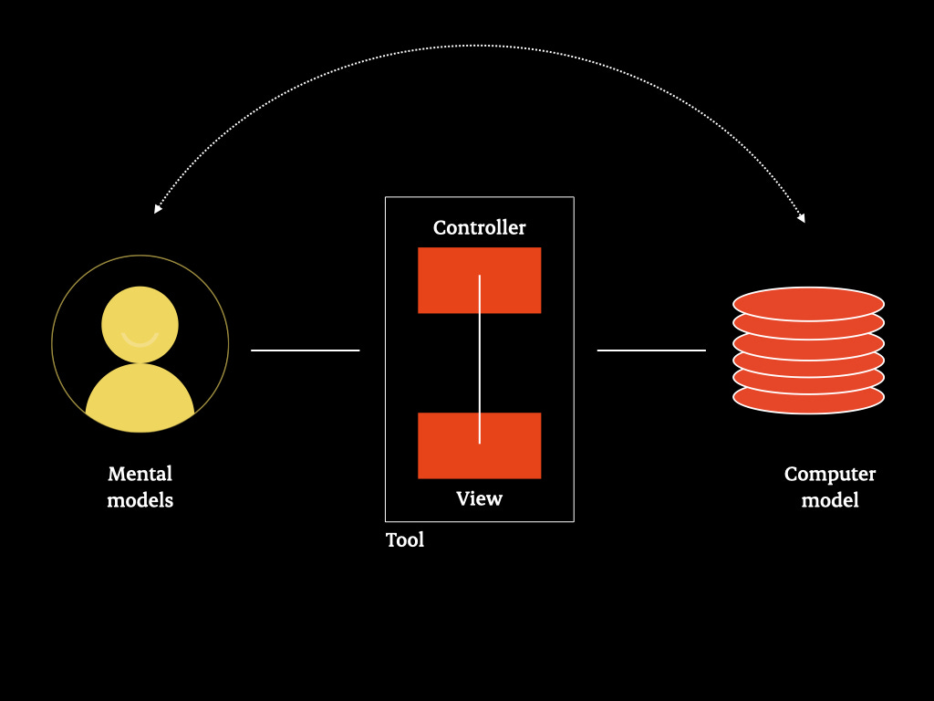 On the left, mental models; on the right, computer models; in the middle, controller and view—essentially, the tool. The modern manifestation of Model-View-Controller (MVC) is a system where a database is on the left, a view (such as an app or website) is on the right, and controllers facilitate communication between the two.