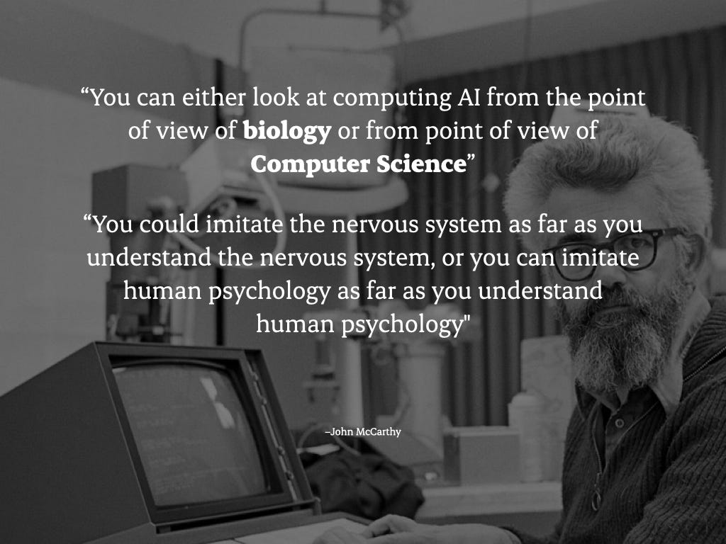 John McCarthy, who co-founded the MIT AI Lab with Marvin Minsky in 1959, once said that you can view computing AI from the perspective of biology or computer science. You could imitate the nervous system as far as you understand the nervous system, or you could imitate human psychology as far as you understand human psychology.