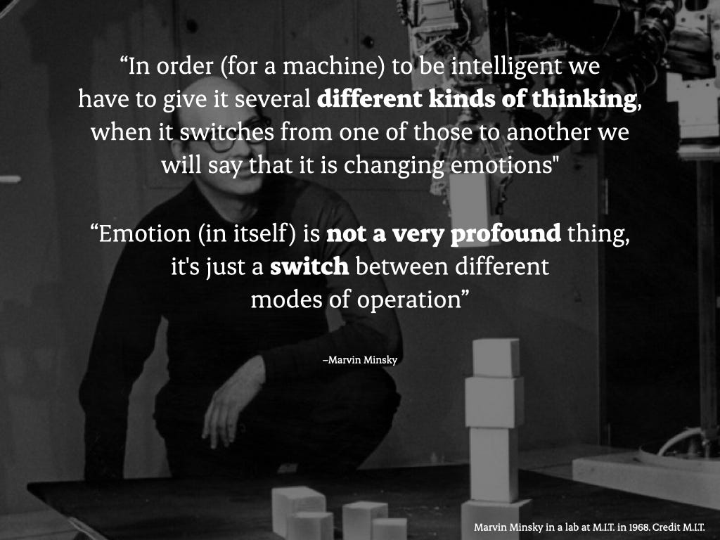 He once said, for a machine to be intelligent, we have to give it several different kinds of thinking. When it switches from one of those to another, we will say that it is changing emotions. Emotion in itself is not a very profound thing—it’s just a switch between different models of operation.
