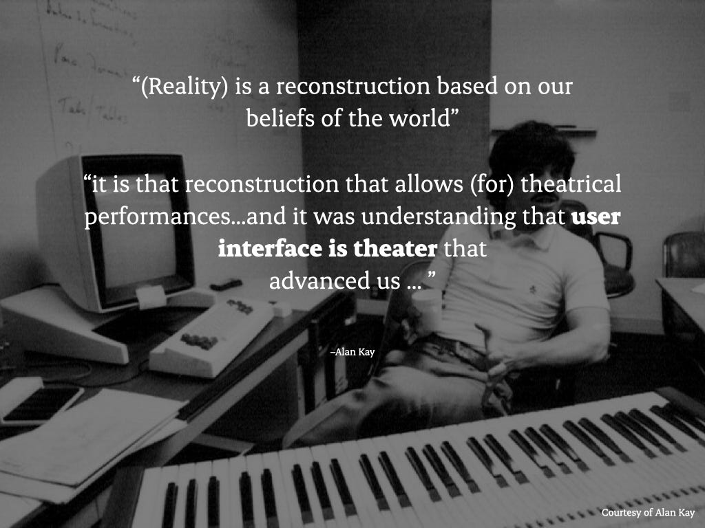Alan Kay once said, “Reality is a reconstruction based on our beliefs of the world.” It is that reconstruction that allows for theatrical performance. It was his understanding that the user interface is the theater that advances us.
