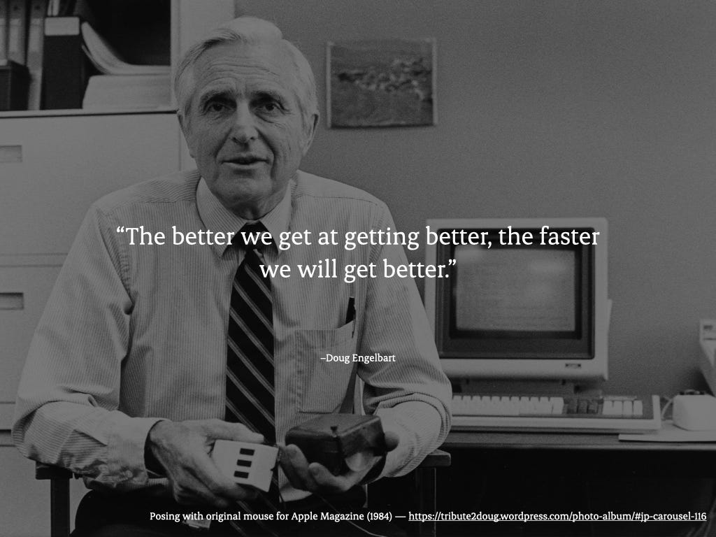 He once said, “The better we get at getting better, the faster we will get better.” Engelbart’s philosophy was that, if you pair groups of thoughtful people with purposeful tools, you get something bigger than just efficiency improvements.